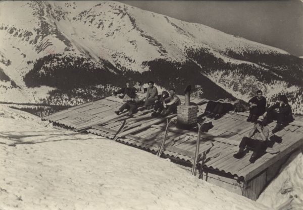 Luková - stacja pośrednia kolei linowej Jasna - Chopok. Na dachu opalający się narciarze. W tle ośnieżone zbocza.