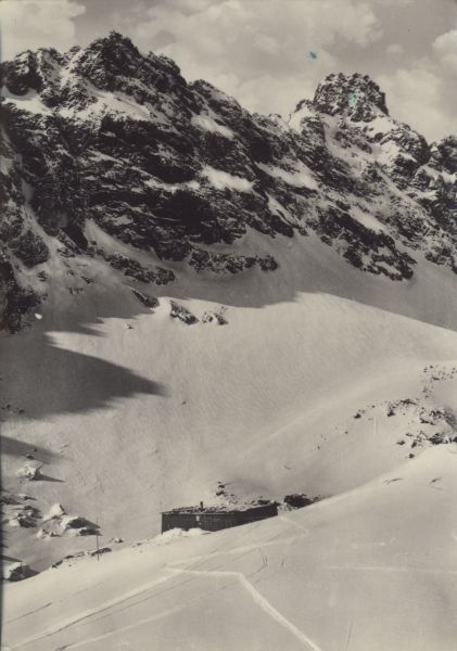 Schronisko Zbójnickie w Dolinie Staroleśnej zimą. W tle Zadnia Nowoleśna Turnia i Staroleśny Szczyt.