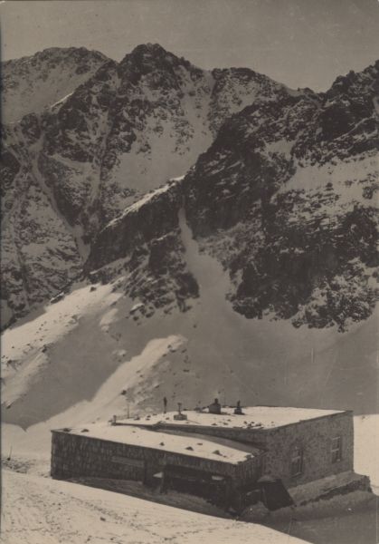Widok na schronisko Zbójnickie w Dolinie Starole¶nej w scenerii zimowej. W tle od lewej: Sławkowski Szczyt, Sławkowska Kopa i Grań Skrajnej Nowole¶nej Turni.