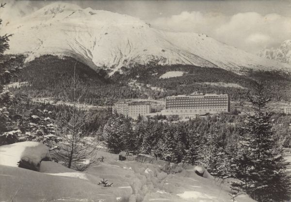 Widok na budynki sanatoryjne w Nowym Smokowcu w scenerii zimowej. W tle Sławkowski Szczyt i Łomnica.