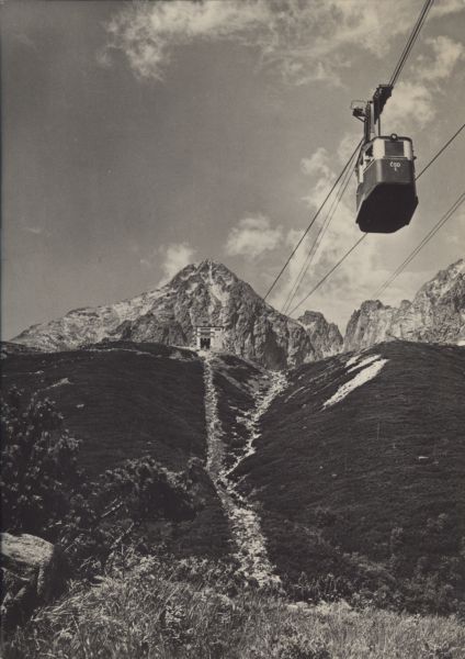 Wagonik kolei linowej na Łomnicę w drodze nad Łomnicki Staw. Widoczny budynek stacji pośredniej. W tle Łomnica, Widły i Kieżmarski Szczyt. Pod koleją płaty kosodrzewiny (Pinus mugo Turra).