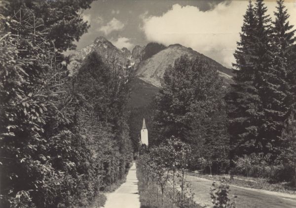 Widok z Tatrzańskiej Łomnicy. Przy ulicy ze szpalerami drzew ko¶ciół ewangelicki. W tle widoczne: Łomnica, Widły i Kieżmarski Szczyt.