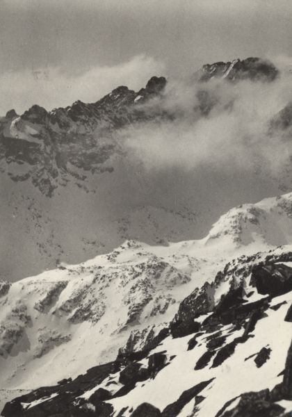 Vysoké Tatry - Veľká Studená dolina - hrebeň Slavkovských veží s Bradavicou (2476 m), vpravo v mraku Gerlachovský štít (2655 m)