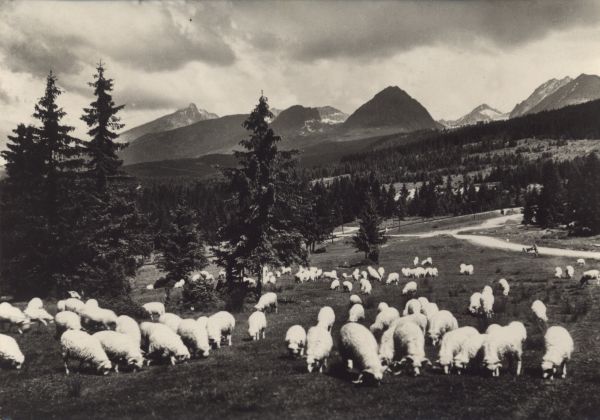 Widok na owce pas±ce się na ł±ce w Szczyrbie. W tle Krywań, Krótka, Ostra, Szczyrbskie Solisko, Szczyrbski Szczyt i Grań Baszt.