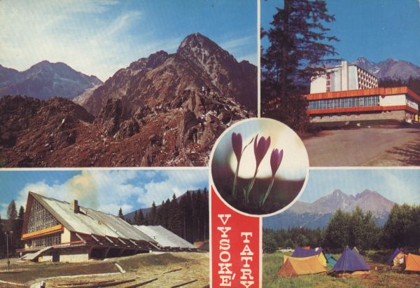 Tatrzański Park Narodowy [Słowacja]. Tatry Wysokie. Łomnica, widok z Łomnickiej Grani. Tatrzańska Łomnica, Zwi±zkowy Dom Wypoczynkowy RZZ Uran. Tatrzańska Łomnica, stacja kolei linowo gondolowej na Łomnicki Staw. Krokus. Tatrzańskie Matlary, widok z campingu namiotowego na Łomnicê (z lewej), Grań Wideł i Kieżmarski Szczyt.