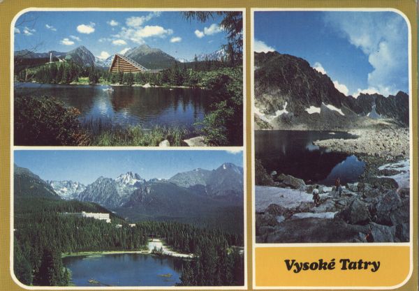 Pocztówka 3 elementowa: Hotel Patria w Szczyrbskim Jeziorze, w tle Solisko i Patria. Sanatorium Helios w Szczyrbskim Jeziorze. Capi Staw w Dolinie Młynickiej.