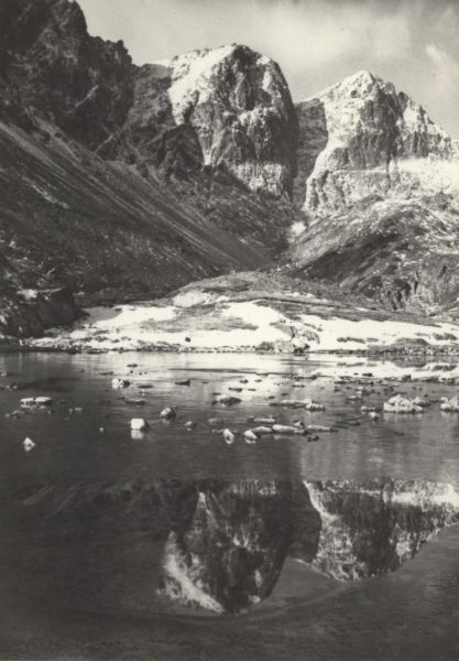 Tatry Wysokie. Widok z Doliny Staroleśnej na Baniastą Turnię i Małą Wysoką. Tytuł również w języku: niem., ang., fr.