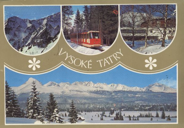 Pocztówka 4. elementowa: Widok z Łomnicy na Sławkowski Szczyt (z lewej) i Gerlach. Kolej linowo-terenowa na Hrebienok. Hotel Park w Nowym Smokowcu. Zimowa panorama zachodniej czê¶ci Tatr Wysokich od Krywania (z lewej)