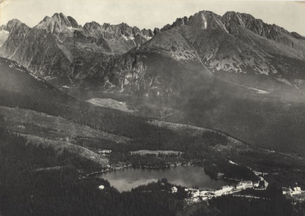 Tatry Wysokie. Szczyrbskie Jezioro z panoram± tatrzańskich szczytów. Tytuł również w języku: niem., ang., fr.