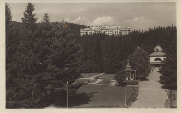 Tatrzańska Łomnica. Łazienki w parku zdrojowym, w tle Grand Hotel Praga.