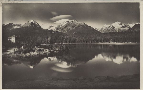 Widok Szczyrbskiego Jeziora z odbijającymi się wodzie ośnieżonymi szczytami. Od lewej: Szczyrbskie Solisko, Szczyrbski Szczyt, Skrajna Baszta, Kopa Popradzka i Wysoka. Na brzegu jeziora willa Marina.