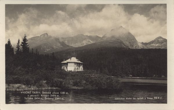 Widok na Szczyrbskie Jezioro wraz z otoczeniem. Na brzegu willa Marina. W tle od lewej: Krywań, Solisko i Szczyrbski Szczyt. Na dole po lewej stronie wpisany tytuł, po prawej nakładca.