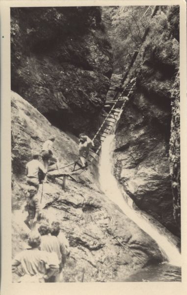 Turyści pokonujący wodospad w dolinie krasowej Sucha Biała w Słowackim Raju.
