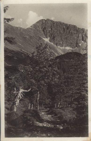 Widok na Rohacz Ostry. Na pierwszym planie drzewa, w głębi las.