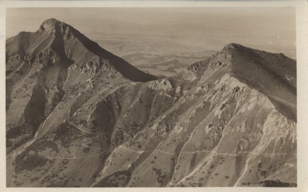 Widok na Tatry Bielskie. Od lewej: Płaczliwa Skała, Szeroka Przełęcz Bielska, Szalony Wierch. Na stokach widoczny szlak turystyczny prowadz±cy na Przełęcz pod Kop±.