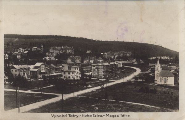 Widok na zabudowania sanatoryjno hotelowe w Nowym Smokowcu. Po prawej stronie widoczny kościół. Po środku biegnie droga. Pod zdjęciem napis Vysoké Tatry. - Hohe Tatra. - Magas Tátra.