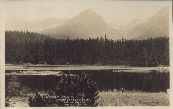 Widok na Nowe Szczyrbskie Jezioro i jego otoczenie. Na pierwszym planie kosodrzewina (Pinus mugo Turra), w głębi las. W tle Krywań, Ostra , Solisko i Szczyrbski Szczyt. Na dole wpisany wydawca i tytuł.
