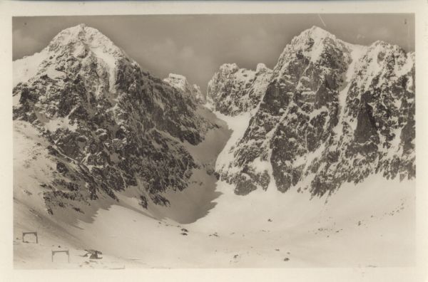 Widok na Łomnicę, Zachodni Szczyt Wideł, Przełęcz w Widłach, Wielki Szczyt Wideł, Wschodni Szczyt Wideł, Kieżmarsk± Przełęcz, Kieżmarski Szczyt i Kieżmarsk± Czubę w scenerii zimowej.