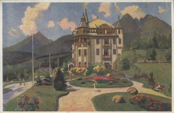 Reprodukcja obrazu Emila Kosy ukazująca uzdrowisko klimatyczne Tatrzańska Łomnica. Widok na Grand Hotel Praga i jego otoczenie. W tle Sławkowski Szczyt i Łomnica.