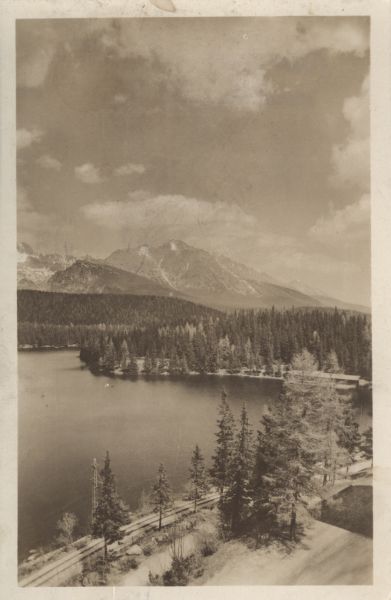 Widok na Tatry Wysokie znad Szczyrbskiego Jeziora. Na pierwszym planie jezioro, po prawej stronie tory kolei elektrycznej, w głębi las. W tle od lewej szczyty: Ganek, Rumanowy Szczyt, Żłobisty Szczyt, Tępa, Kończysta. Z przodu Osterwa.
