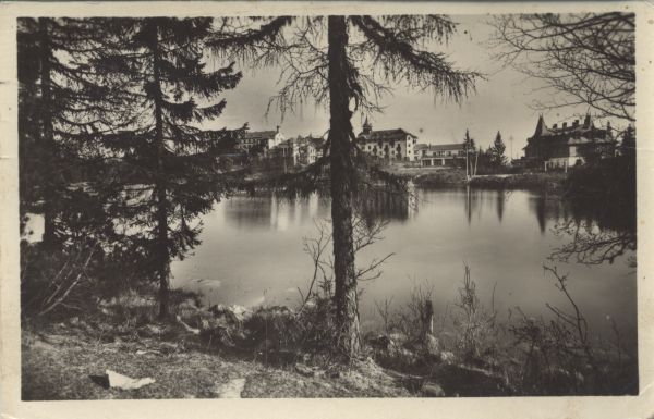 Widok na Szczyrbskie Jezioro i jego otoczenie. Na pierwszym planie pojedyncze drzewa. W tle zabudowania sanatoryjno - hotelowe Szczyrbskiego Jeziora.