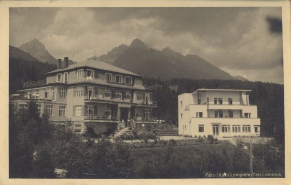 Widok na pensjonat i sanatorium Na vyhliadke (Na Widoku) i pensjonat Miramonti (Cudowna Góra) w Górnym Smokowcu. W tle Pośrednia Grań i masyw Łomnicy. Na dole po prawej stronie wpisane nazwisko fotografa.