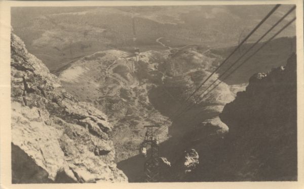 Górna stacja kolei linowej na Łomnicy - widok w dół, na Dolinę Łomnicką. Widoczny wagonik kolei i podpora. U góry pośrednia stacja kolei linowej nad Łomnickim Stawem.