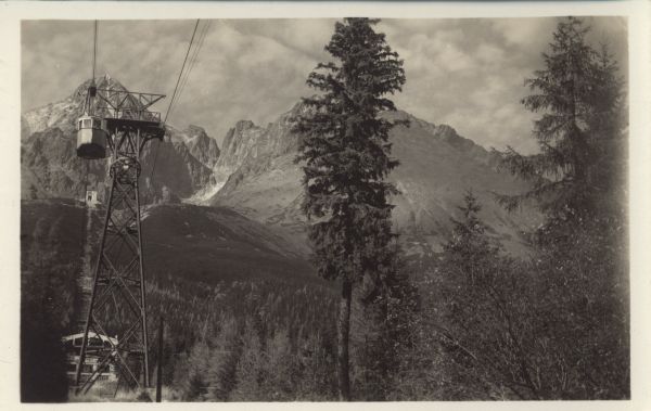 Wagonik kolei linowej na Łomnicę na trasie do Łomnickiego Stawu przy podporze. Wśród drzew widoczna stacja pośrednia - Start. Wyżej stacja nad Łomnickim Stawem. Na pierwszym planie limba (pinus cembra L.). W tle Łomnica, Widły i Kieżmarski Szczyt.