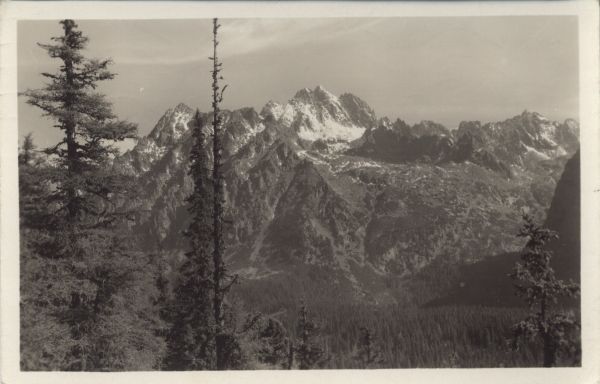 Widok z Magistrali Tatrzańskiej na Kopę Popradzką, Wysoką, Ganek, Rumanowy Szczyt, Żłobisty Szczyt oraz Dolinę Mięguszowiecką. Po lewej stronie limby (Pinus cembra L.), w głębi las.