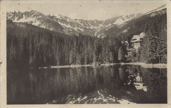 Widok na Wrbicki Staw w Jasnej i jego otoczenie. Nad stawem schronisko Mikołaja. W tle przełęcz Poµany i szczyt Poµana (na prawo).