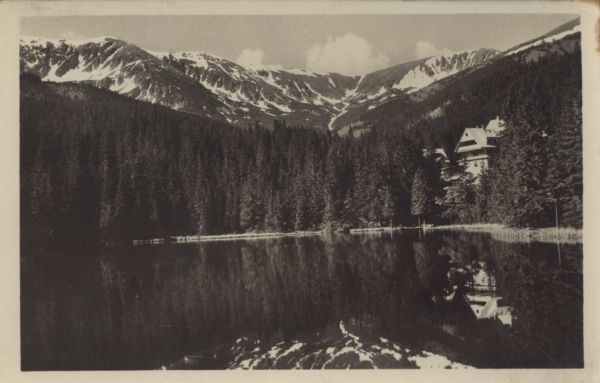 Widok na Wrbicki Staw w Jasnej i jego otoczenie. Nad stawem schronisko Mikołaja. W tle przełęcz Poµany i szczyt Poµana (na prawo).
