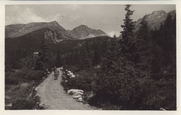 Widok w kierunki Doliny Furkotnej. Na pierwszym planie droga, po której idą dwie osoby. W tle Ostra, Krótka i Wielkie Solisko.
