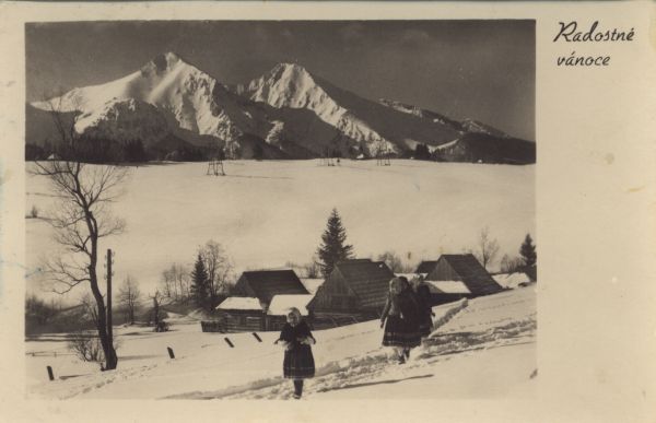 Zimowy widok na Tatry Bielskie ze Zdziaru. Na pierwszym planie 5 dziewczynek, za nimi drewniane domy i drzewa. W tle Płaczliwa Skała i Hawrań. Obok fotografii życzenia świąteczne: Radostné vánoce.