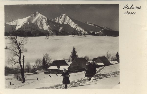 Zimowy widok na Tatry Bielskie ze Zdziaru. Na pierwszym planie 5 dziewczynek, za nimi drewniane domy i drzewa. W tle Płaczliwa Skała i Hawrań. Obok fotografii życzenia świąteczne: Radostné vánoce.