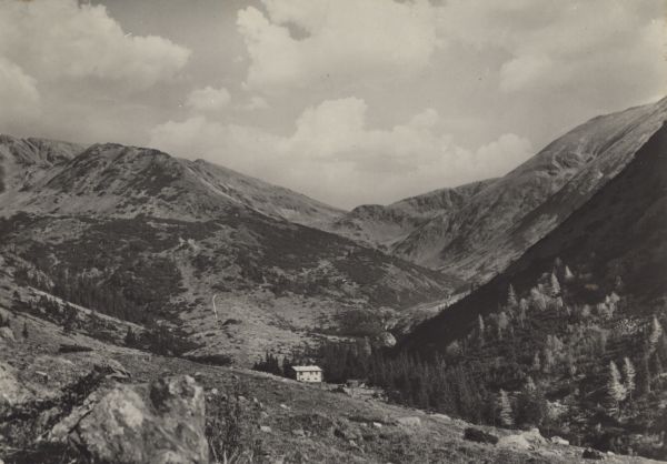 Widok na schronisko Żarskie w dolinie Żarskiej. W tle Żarska Przełęcz.