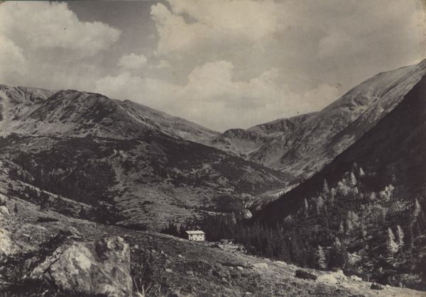 Widok na schronisko Żarskie w dolinie Żarskiej. W tle Żarska Przełęcz.