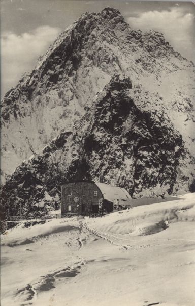 Schronisko Téryego w Dolinie Pięciu Stawów Spiskich w scenerii zimowej. W tle Pośrednia Grań i Żółty Szczyt.