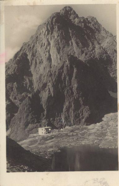 Schronisko Téryego w Dolinie Pięciu Stawów Spiskich. Na pierwszym planie Pośredni Staw Spiski. W tle Pośrednia Grań i Żółty Szczyt.