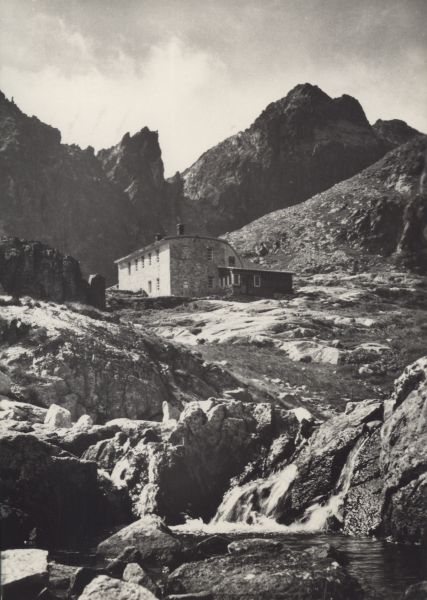 Tatry Wysokie. Schronisko Téryego w Dolinie Małej Zimnej Wody przy Pięciu Stawach Spiskich, w tle Spąga, Czerwona Ławka i Mały Lodowy Szczyt.