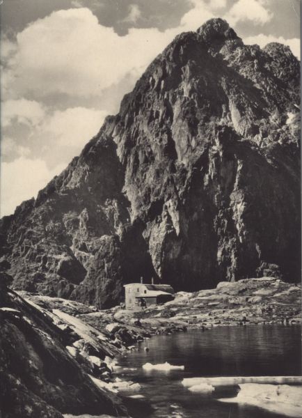 Schronisko Téryego w Dolinie Pięciu Stawów Spiskich. Na pierwszym planie Pośredni Staw Spiski. W tle Pośrednia Grań i Żółty Szczyt.