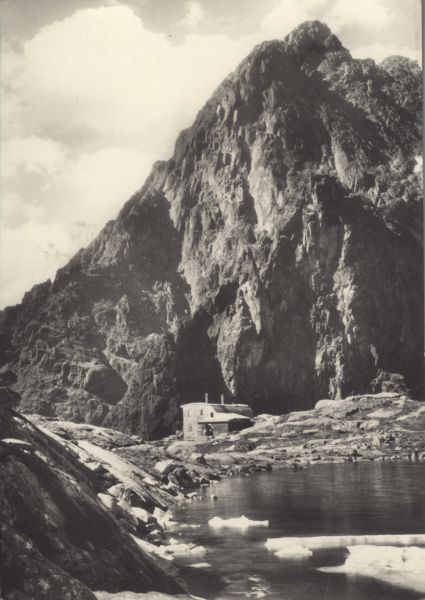 Schronisko Téryego w Dolinie Pięciu Stawów Spiskich. Na pierwszym planie Pośredni Staw Spiski. W tle Pośrednia Grań i Żółty Szczyt.