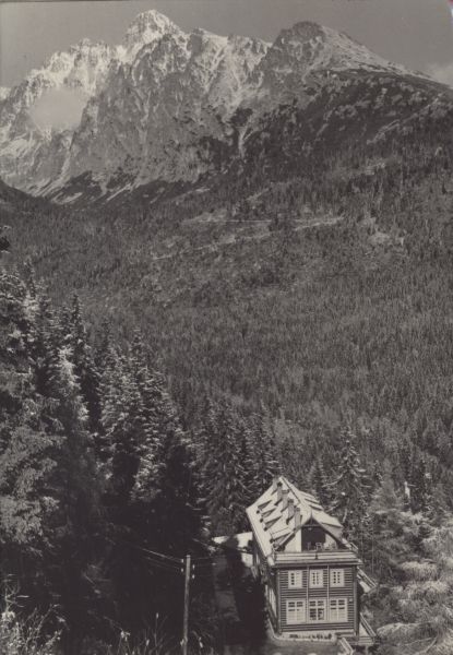 Schronisko Pavla Bilika pod Siodełkiem. Na pierwszym planie po lewej stronie świerki (Picea A. Dietr.), w głębi las. W tle od lewej: Durny Szczyt, Łomnica, Kieżmarski Szczyt i Huncowski Szczyt.