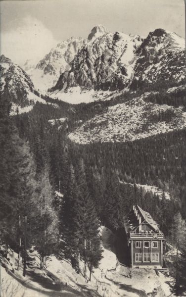 Widok na Schronisko Pavla Bilika pod Siodełkiem w scenerii zimowej. Po lewej stronie świerki (Picea A. Dietr.). W tle Pośrednia Turnia, Łomnica, Kieżmarski Szczyt i Huncowski Szczyt.