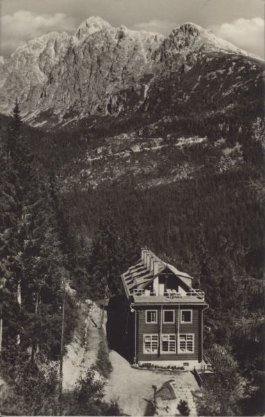 Schronisko Pavla Bilika pod Siodełkiem. Na pierwszym planie po lewej stronie świerki (Picea A. Dietr.), w głębi las. W tle Łomnica, Kieżmarski Szczyt i Huncowski Szczyt.