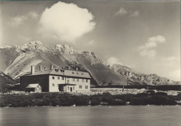 Tatry Wysokie. Schronisko Kieżmarskie nad Wielkim Białym Stawem. W tle Tatry Bielskie.