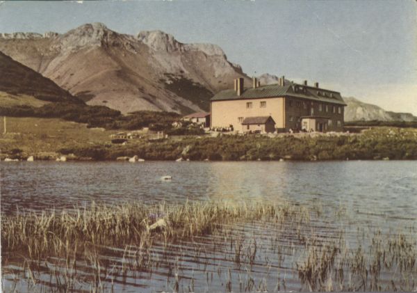 Widok na schronisko Kieżmarskie w Dolinie Białych Stawów. Na pierwszym planie Wielki Biały Staw. W tle szczyty Tatr Bielskich, od lewej: Jatki, Golica Bielska, Bujaczy Wierch, Rakuski Grzbiet.