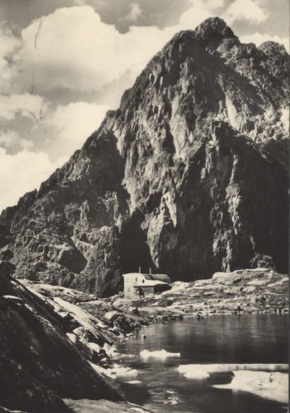 Schronisko Téryego w Dolinie Pięciu Stawów Spiskich. Na pierwszym planie Pośredni Staw Spiski. W tle Pośrednia Grań i Żółty Szczyt.