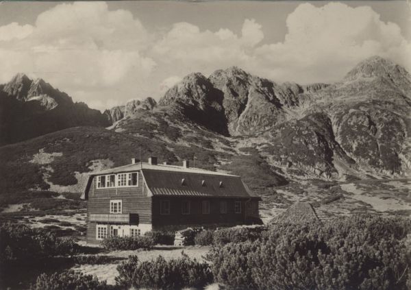 Tatry Wysokie - Schronisko Kieżmarskie (Państwowe Centrum Wychowania Fizycznego). W tle Durny Szczyt, Kozi Szczyt i Jagnięcy Szczyt.