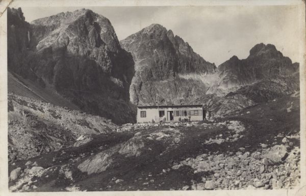 Tatry Wysokie. Schronisko Zbójnickie KCzST. W tle Baniasta Turnia, Mała Wysoka, Rohatka i Dzika Turnia.