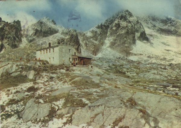 Tatrzański Park Narodowy [Słowacja] - Dolina Małej Zimnej Wody, schronisko Téryego. Od lewej: Sp±ga, Mały Lodowy Szczyt i Lodowa Kopa. Tytuł również w języku: ros., ang., niem.